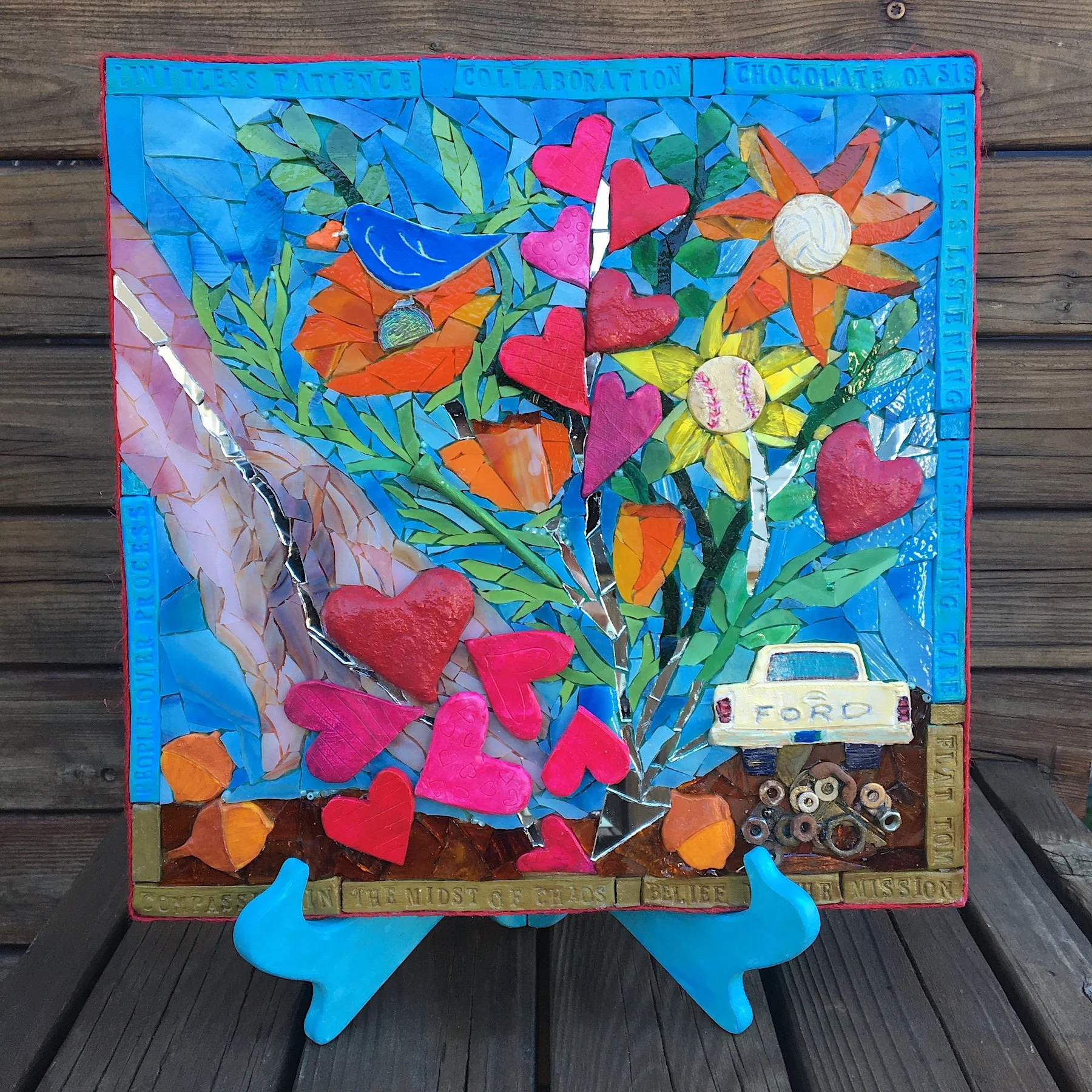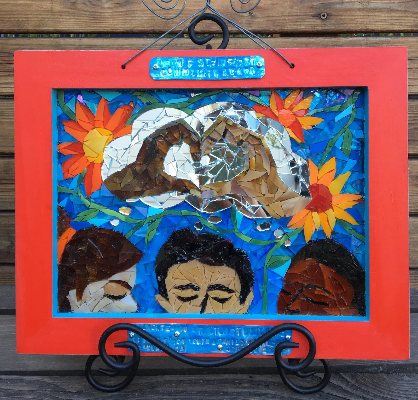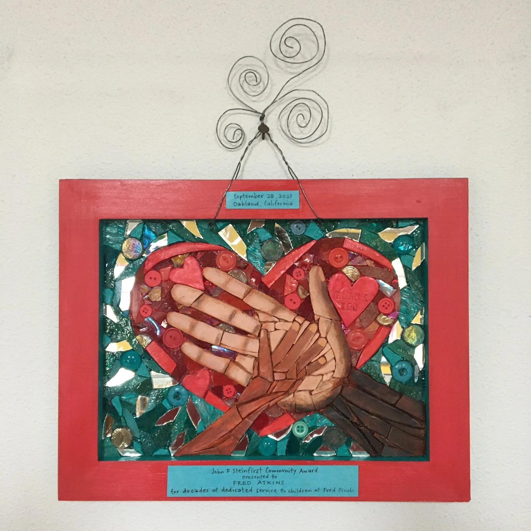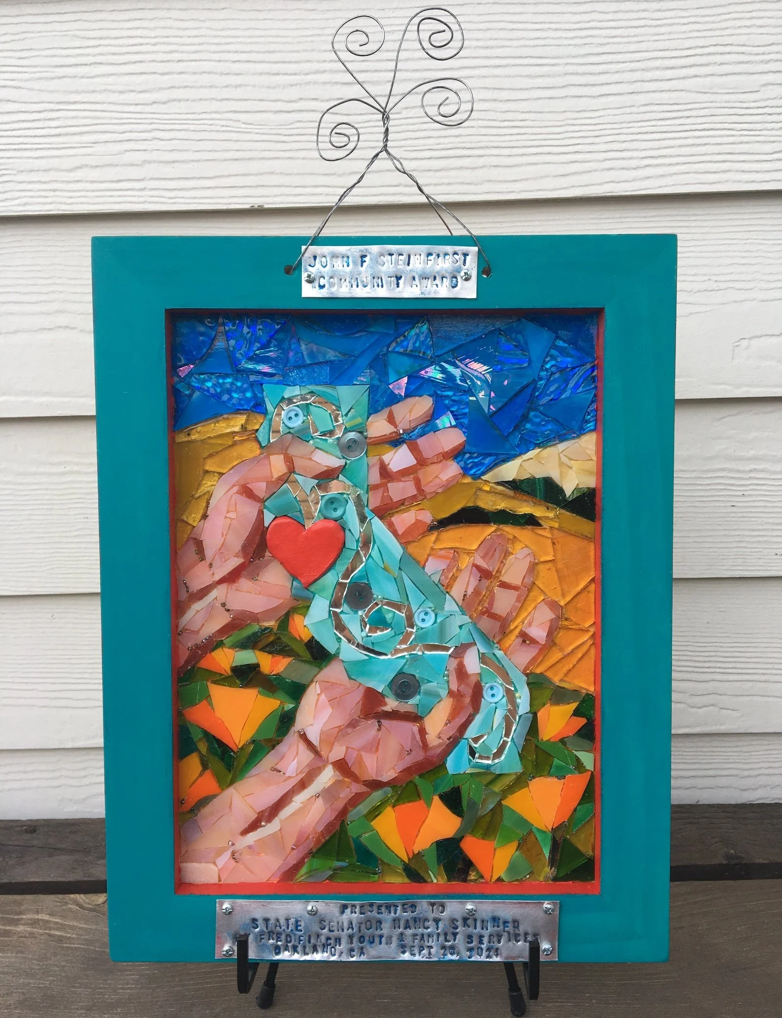 In 2016, Fred Finch Youth Center in Oakland, CA initiated an annual award celebration to recognize a community leader who has positively impacted the region’s children and families. I had created several mosaic murals on their campus and was honored when FFYC’s president approached me about creating an art piece to be the award. Each year. Because they didn’t want to give out a generic etched plaque that would surely end up in a box in the attic gathering dust.